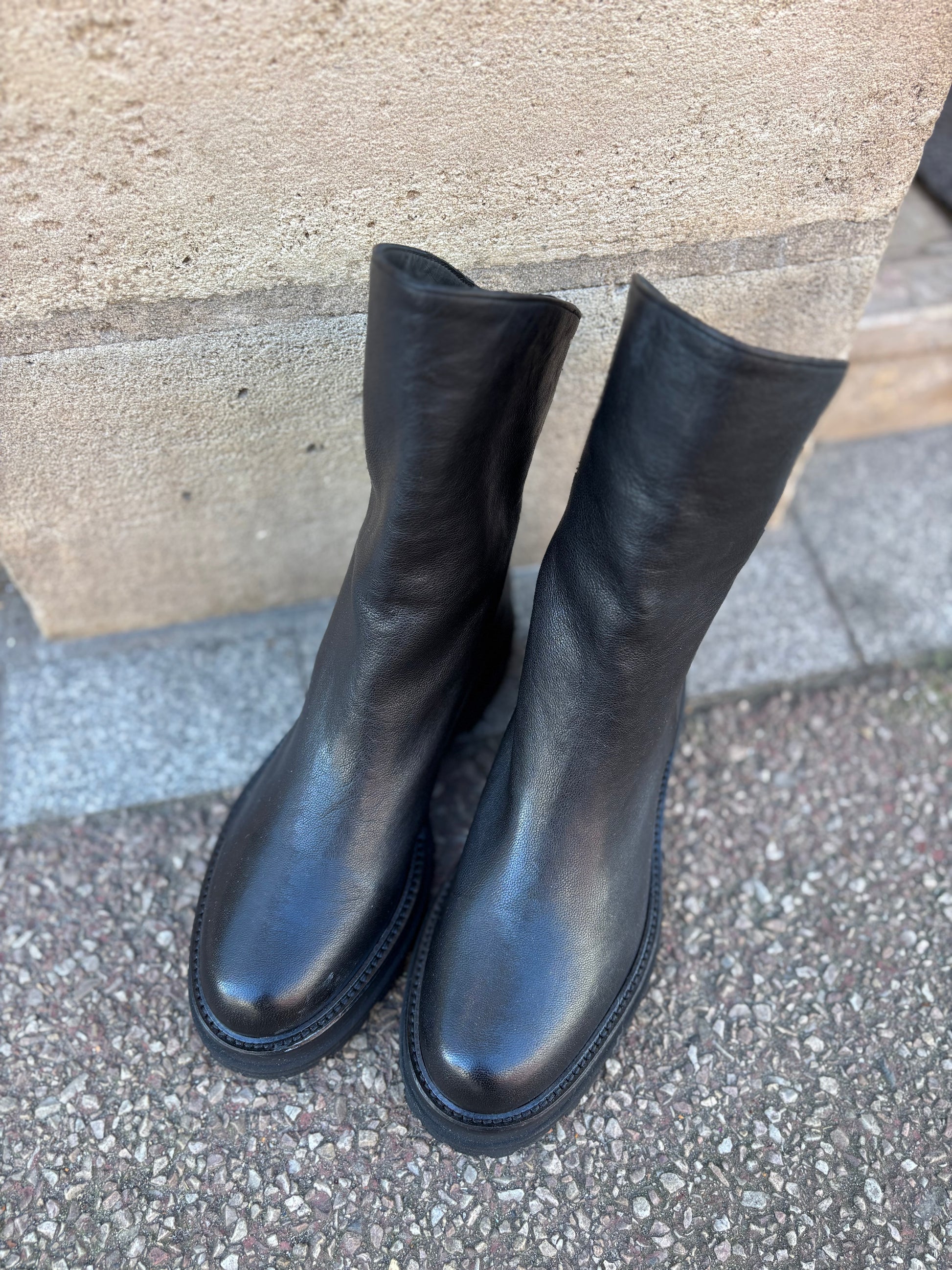 La bottine intemporelle avec sa forme biseauté et sa légèreté ! Existe également en peau ivoire et cuir imprimé léopard.