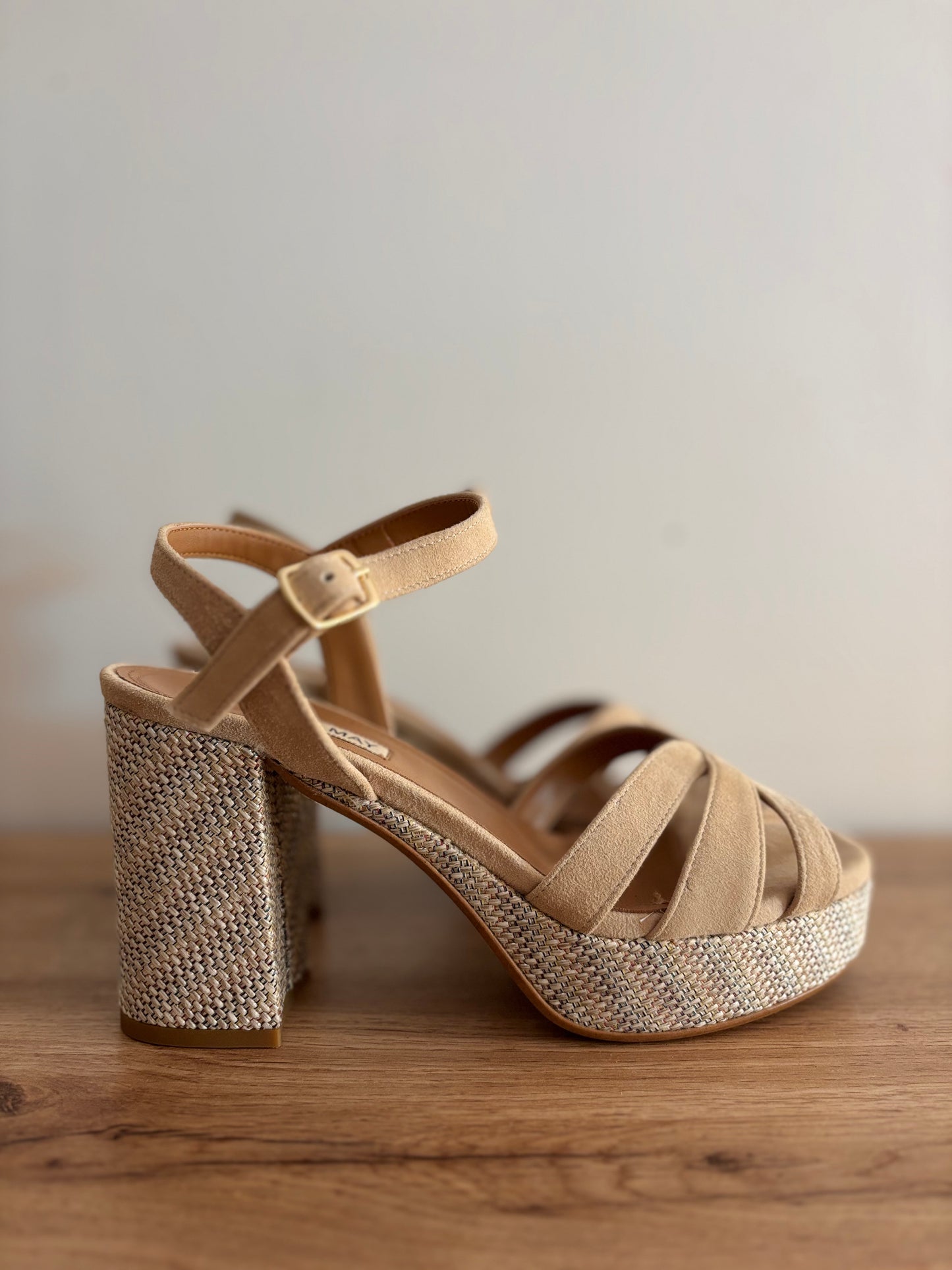 Cette sandale est très élégante avec sa forme en cuirs velours beige, son talon ajourée très original, c'est la sandale pour toutes vos occasions.