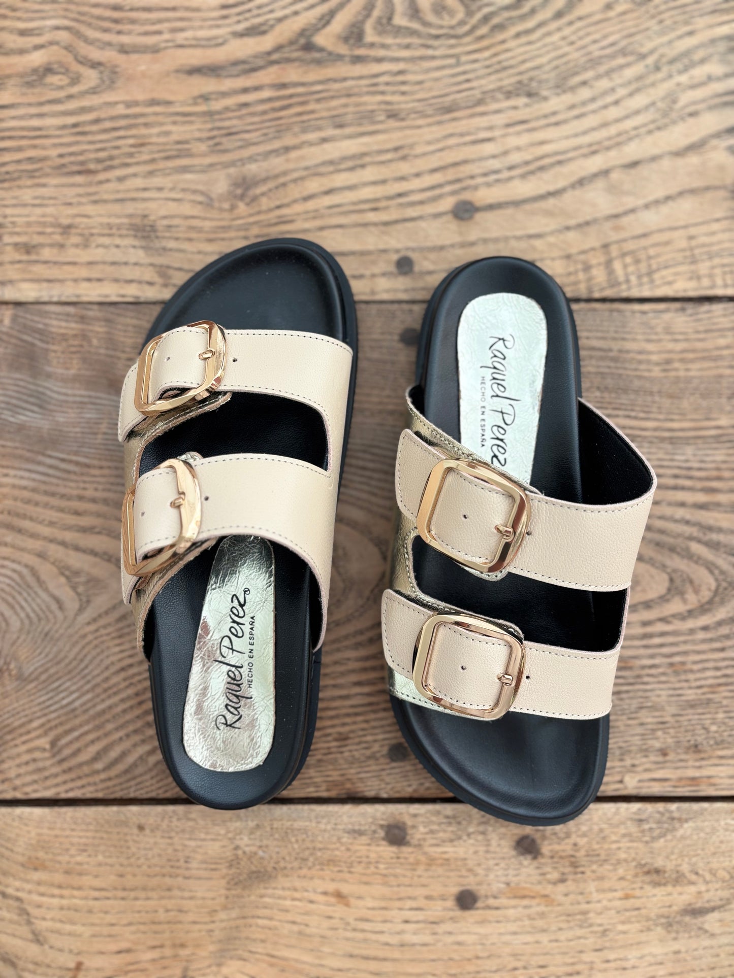 Mûles ASAMOAH en cuir beige/doré de RAQUEL PEREZ.