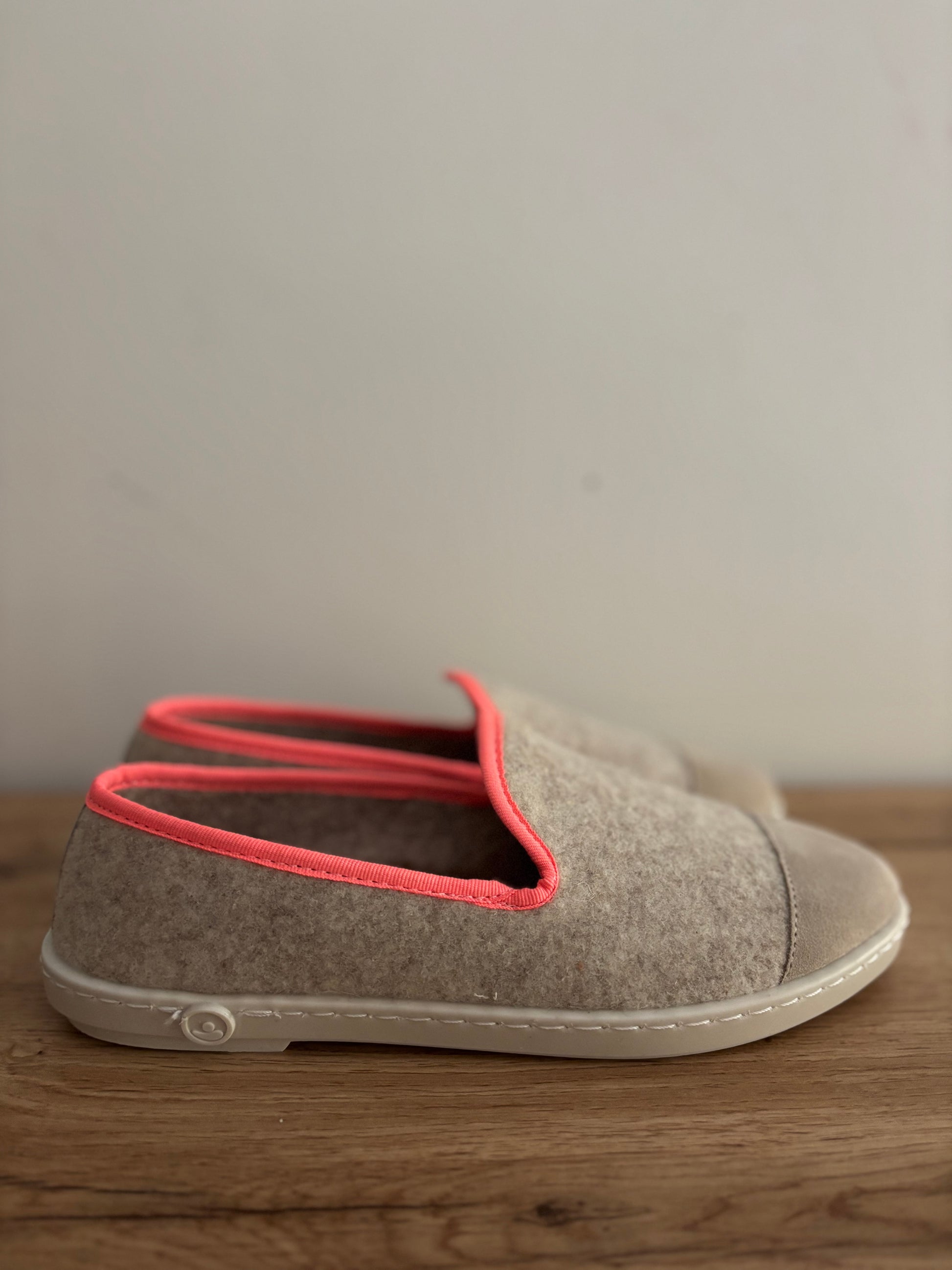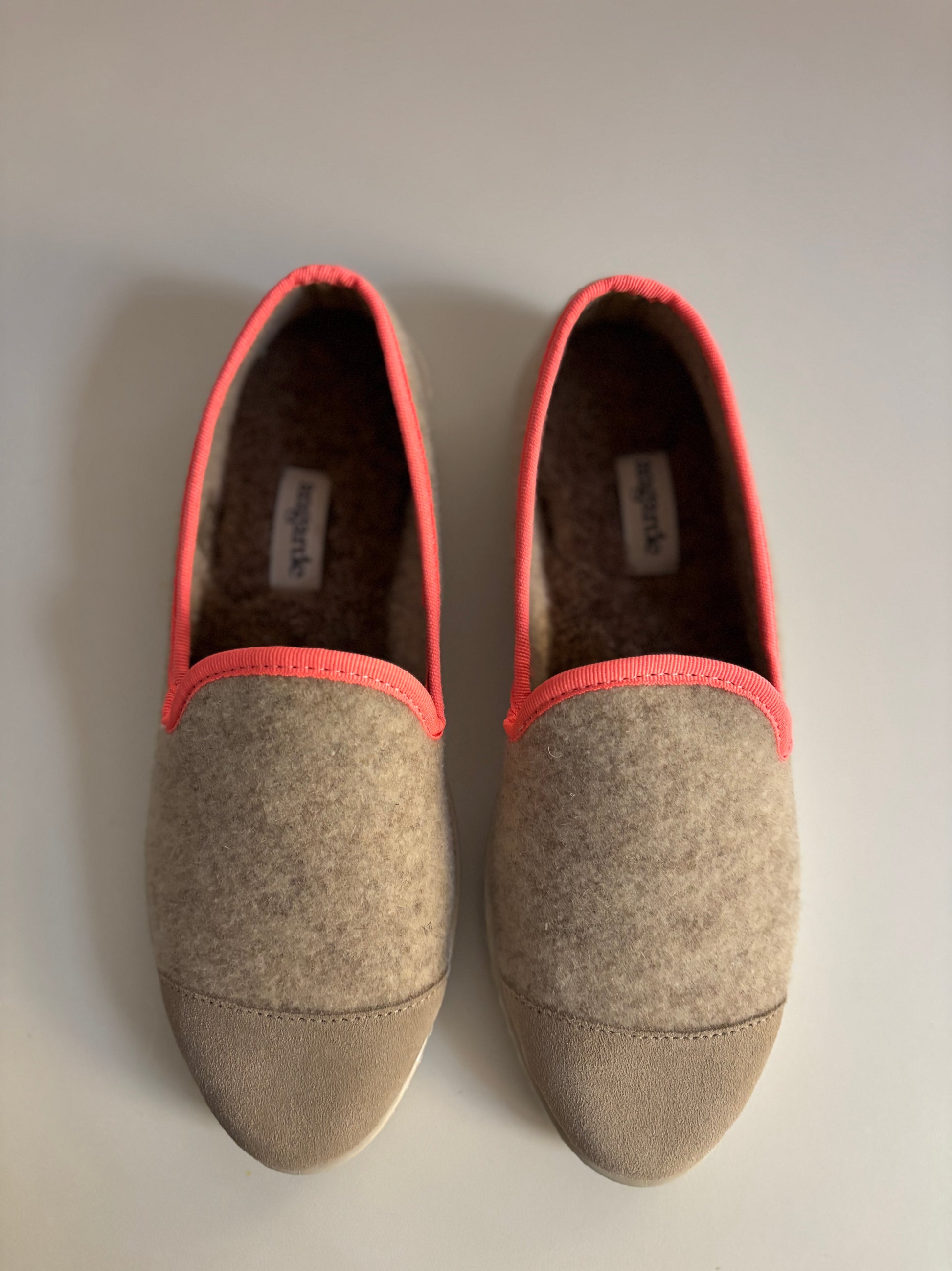 Chausson en laine recyclée beige et rose fluo de ANGARDE.
