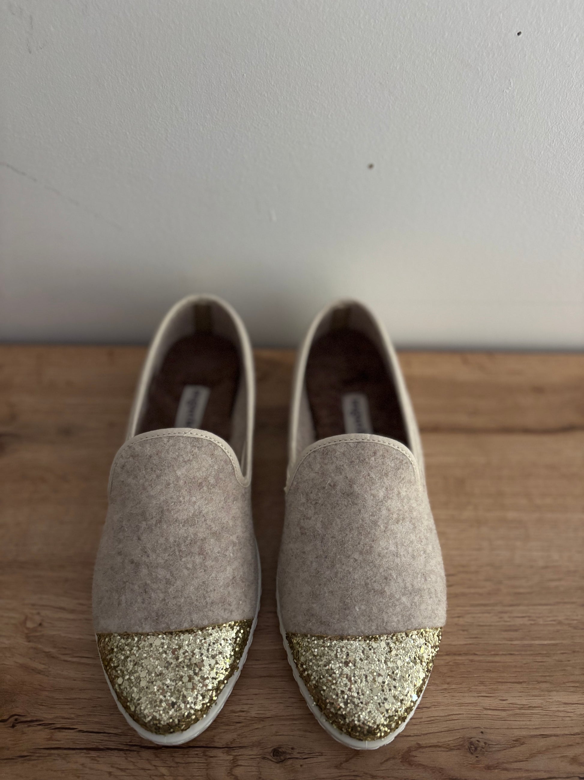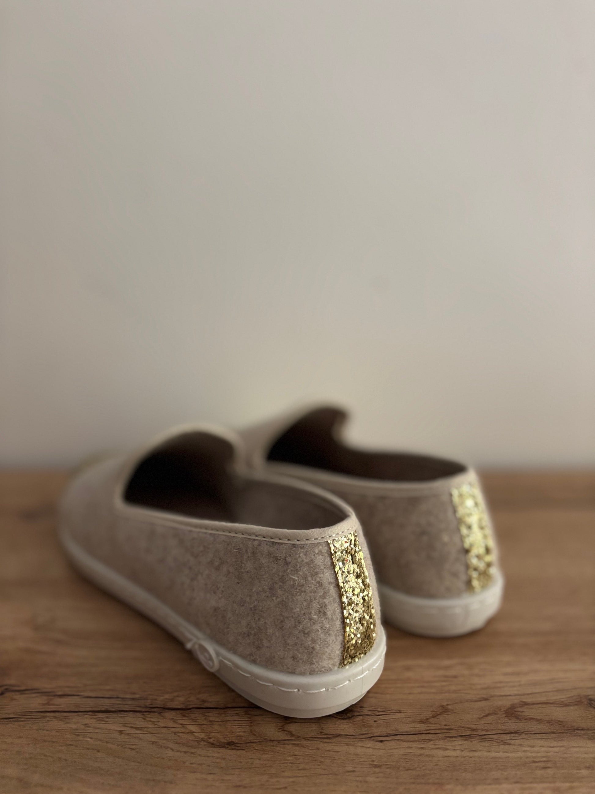 Chausson en laine recyclée beige et paillette dorée de ANGARDE.