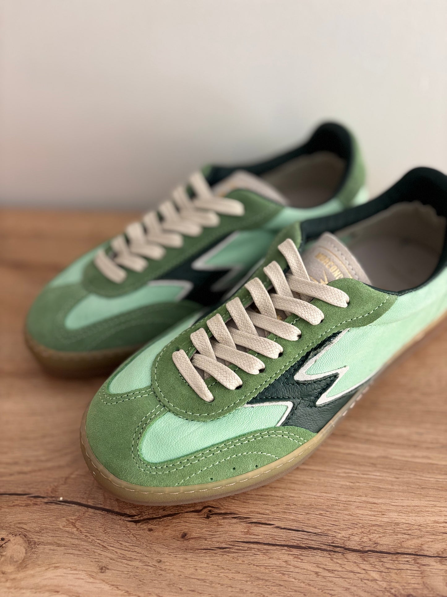 Baskets basses ultra souple, confortable et surtout un look irrésistible ! Fabriquées en Italie, ces mélanges de vert et de cuirs lui donne un look original.