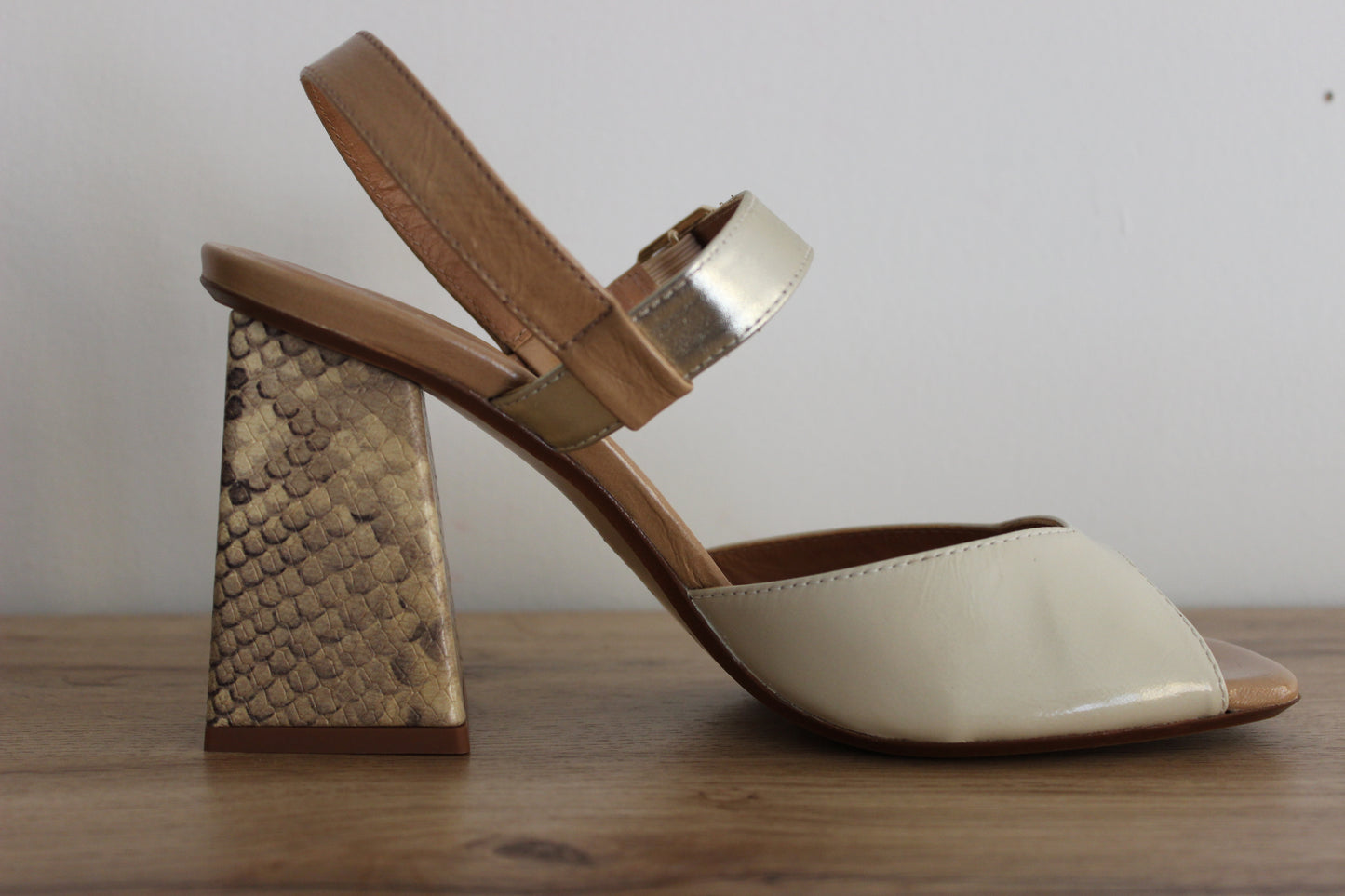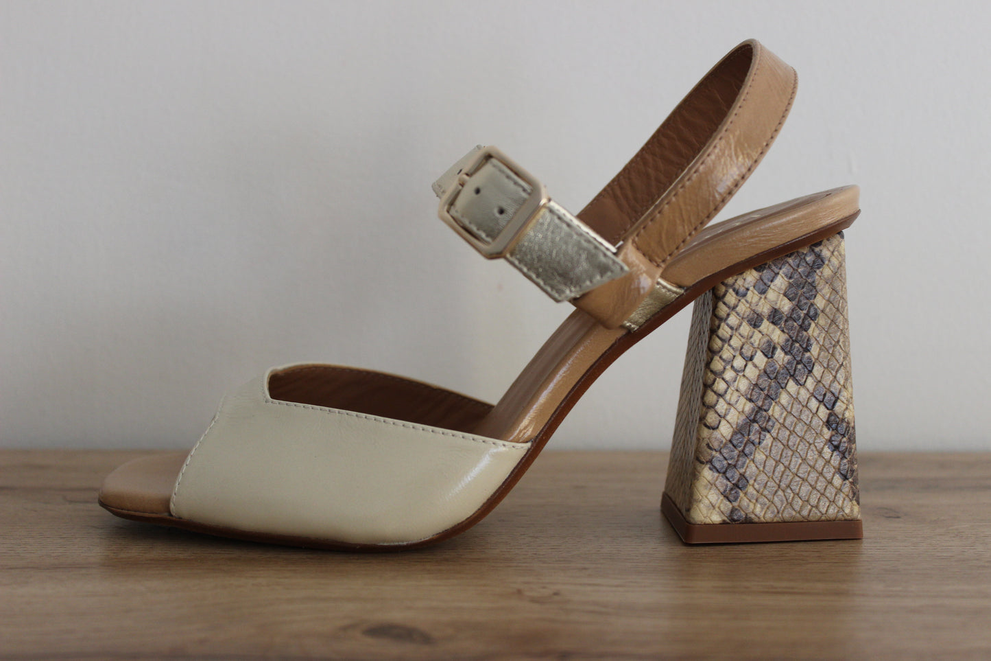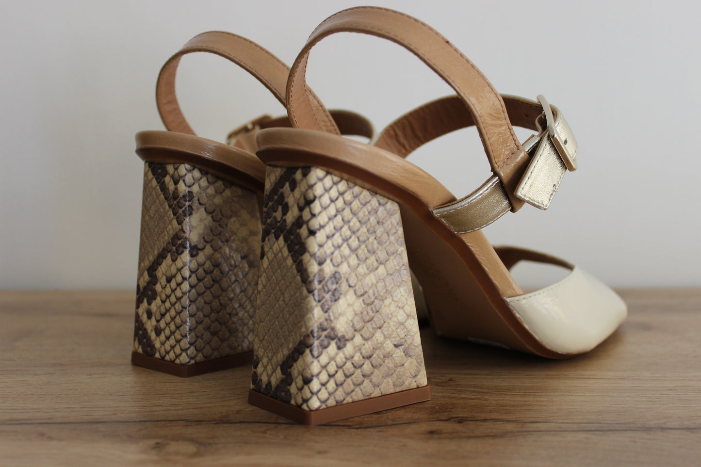 Sandale pour femme GEISA de LODILOVE en cuir off white et talon façon python. Une sandale parfaite pour être glamour en toutes circonstances. Fermeture latérale par boucle à la cheville. Bout carré. Inclut une semelle new gel pour un plus grand confort dans tous vos pas.