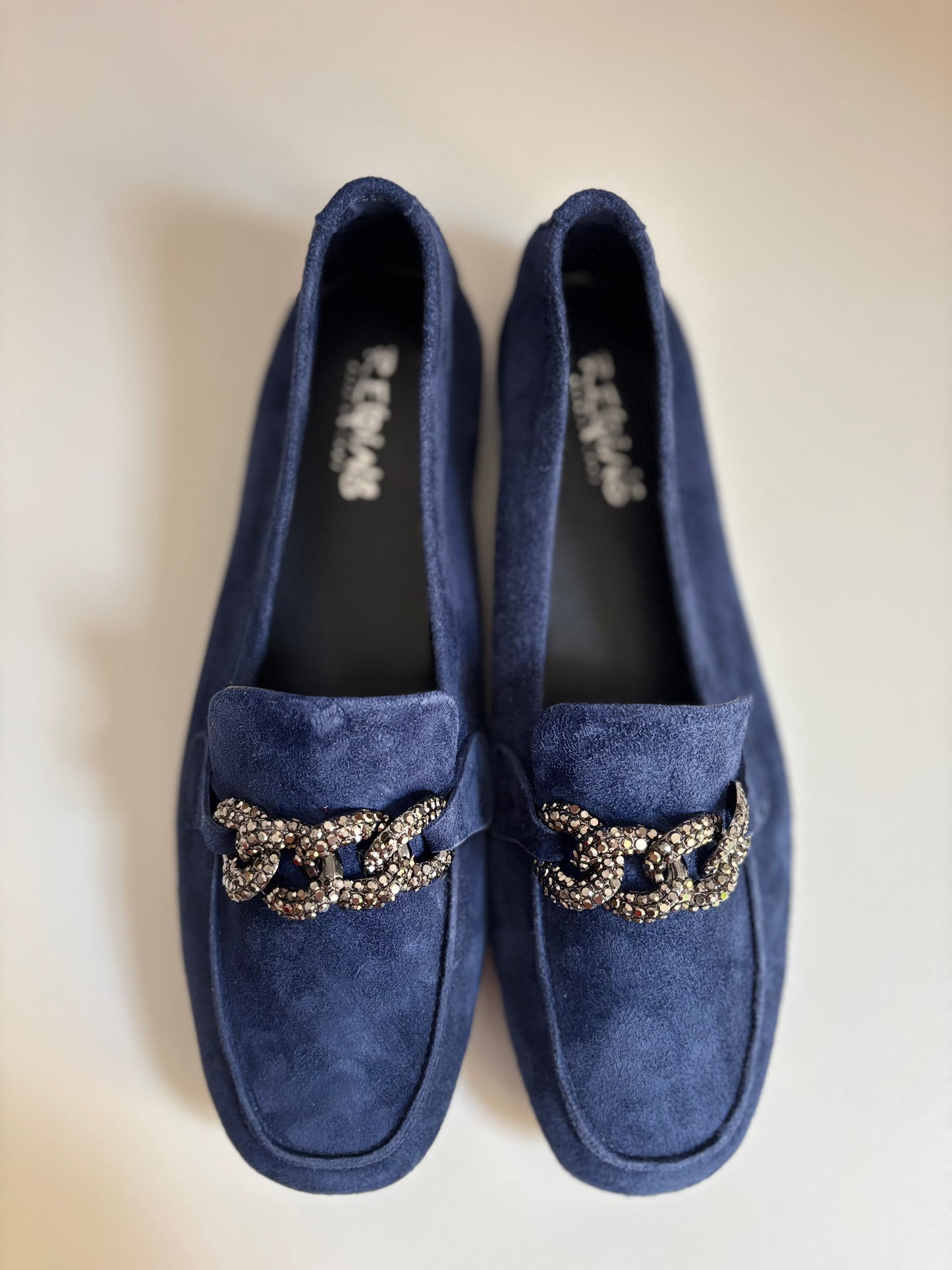 Ce mocassins style collège en cuirs velours avec son bout carré est un modèle intemporel. Son petit plus, son bijoux argent lui donne du chic. Existe également en cuirs velours nude.