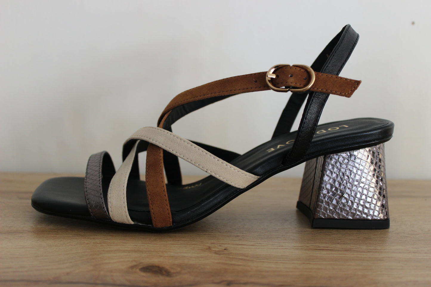 Sandale pour femme MIL4378 de LODILOVE en cuir noir et peau cognac et beige et talon façon python métallisé. Une sandale parfaite pour être glamour en toutes circonstances. Fermeture latérale par boucle à la cheville. Bout carré. Inclut une semelle new gel pour un plus grand confort dans tous vos pas.