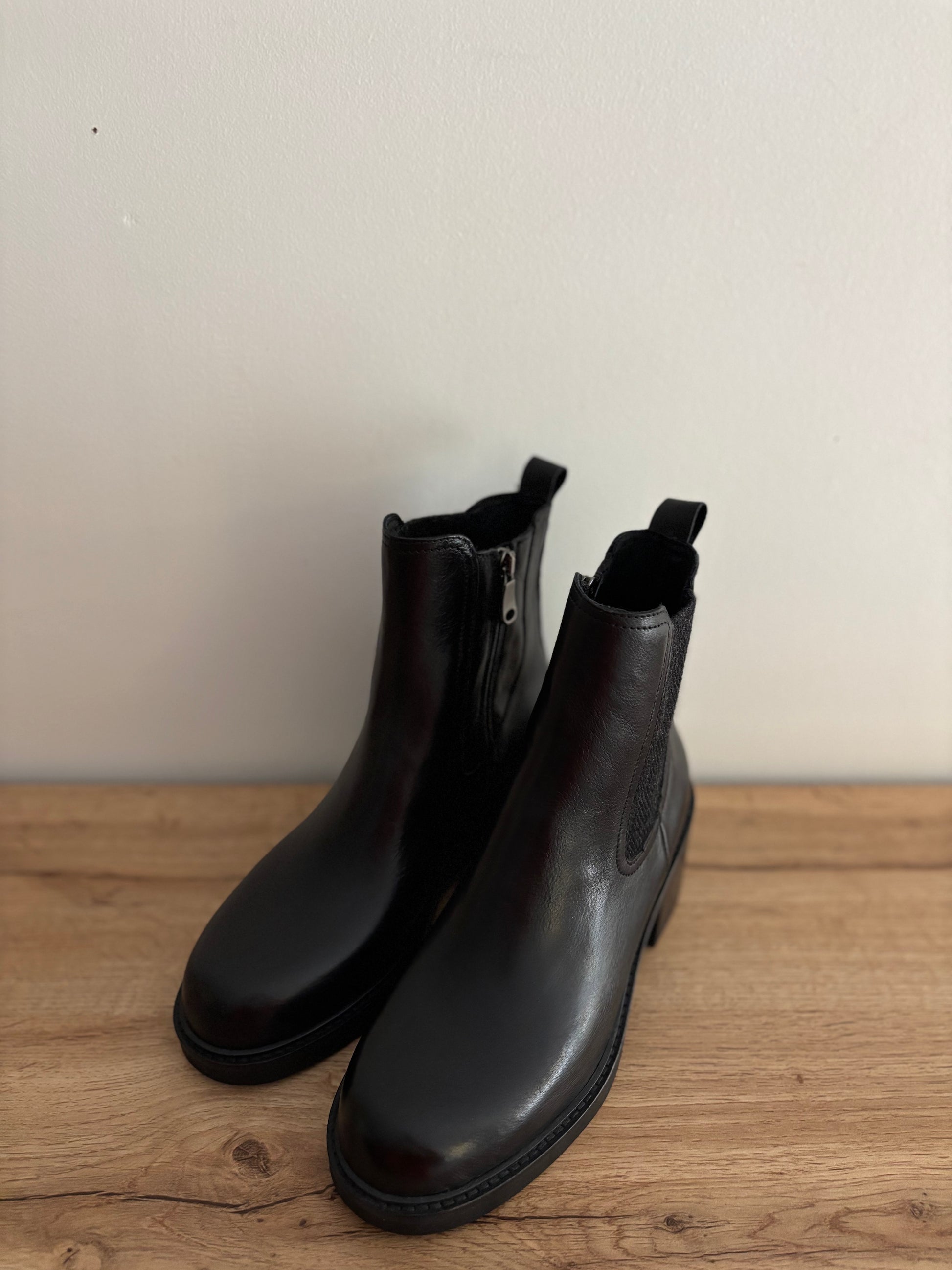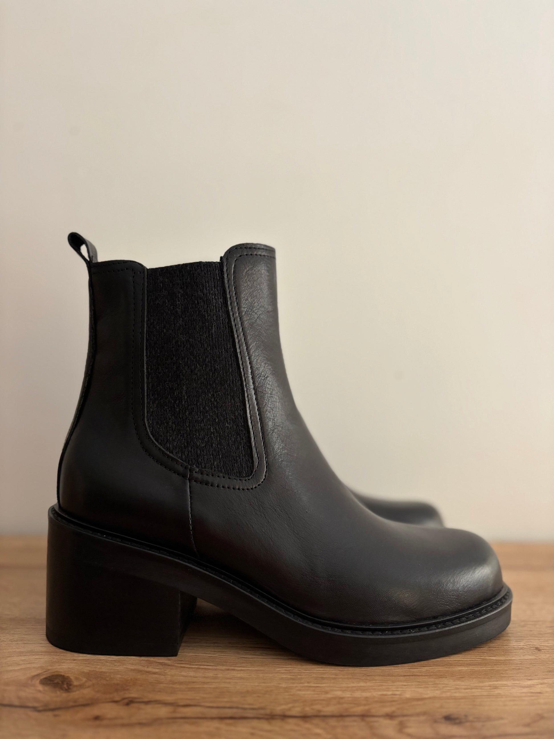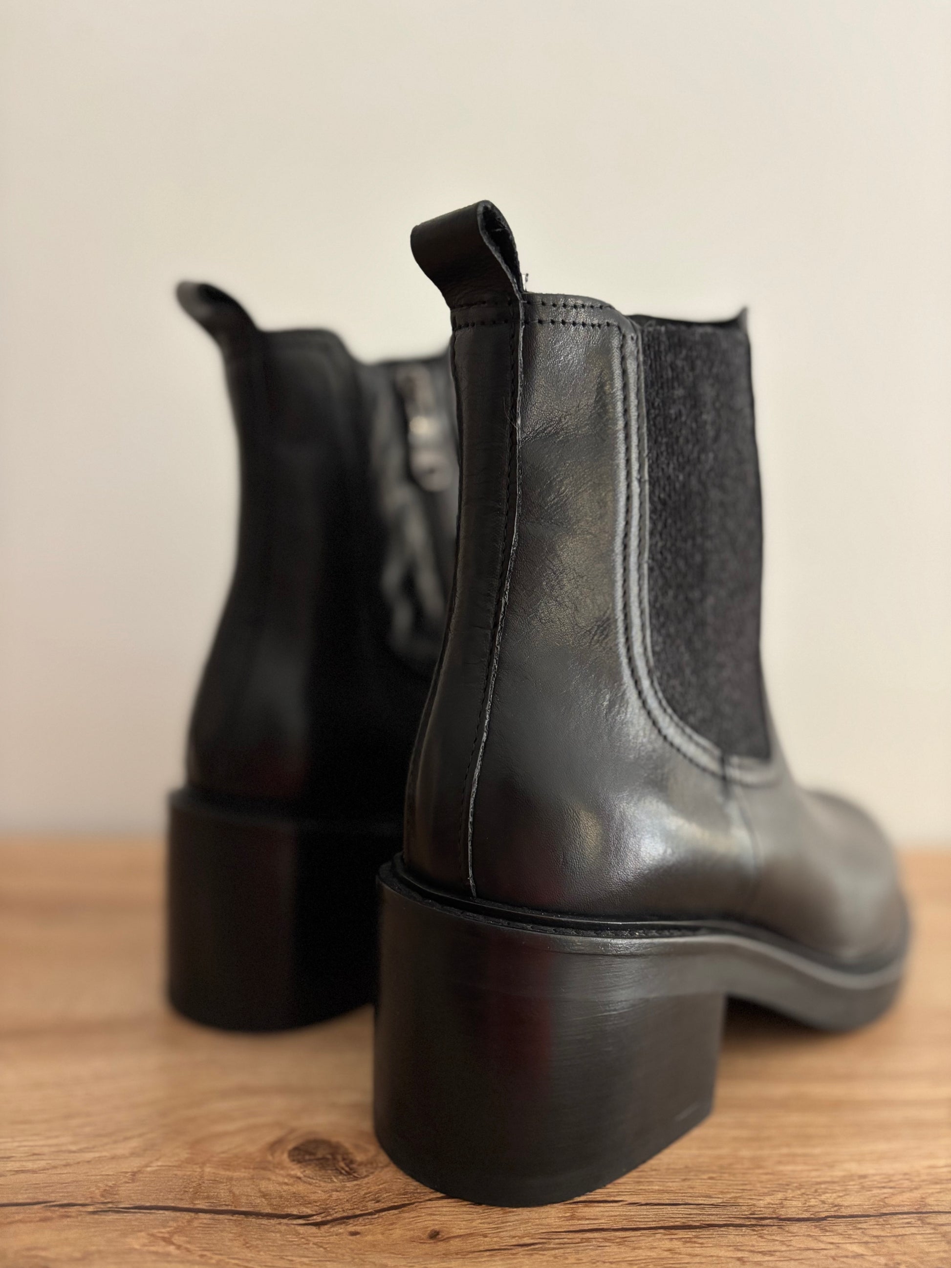 Bottines noir à talon en cuir, facile à enfiler avec sa fermeture à l'intérieur et son soufflet en laine mélangé pour une meilleure souplesse. Des bottines noirs qui s'associe avec beaucoup de choses et qui on un look rock & roll.