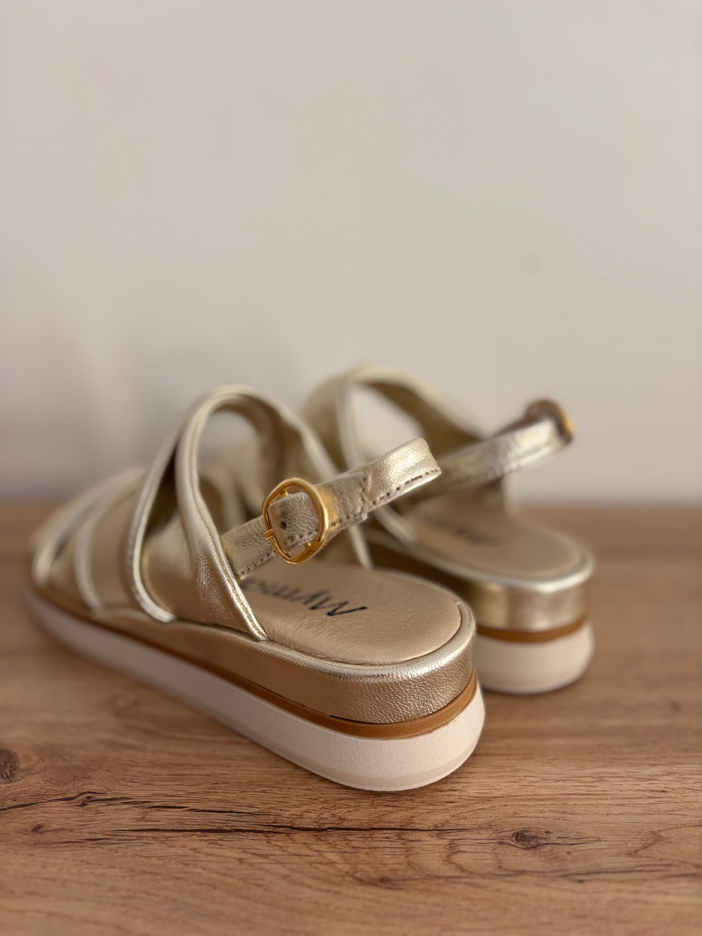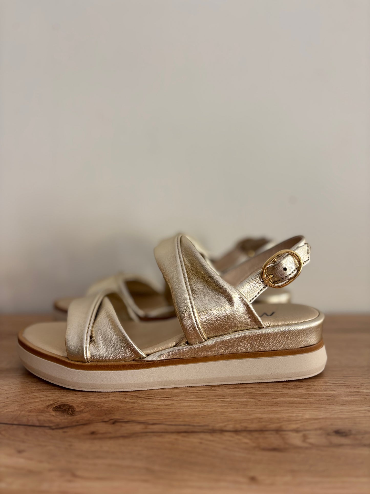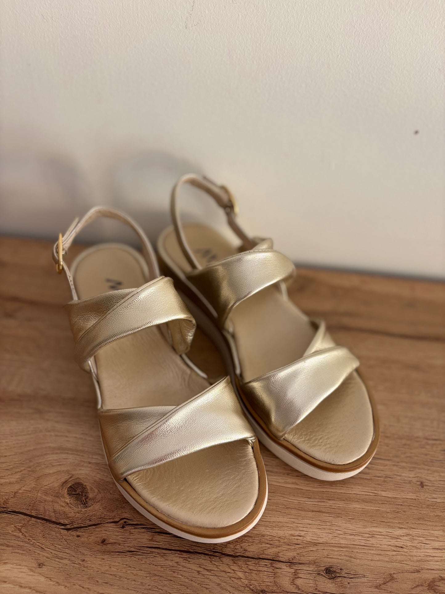 Sandales compensées en cuirs platine, qui s'associeront avec toutes vos tenues estivales, à la fois classique et moderne avec sa forme.