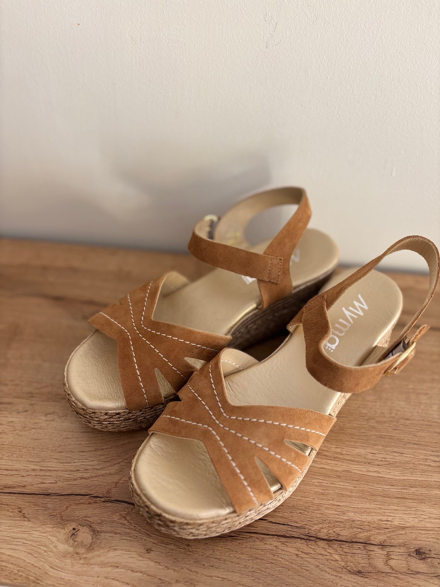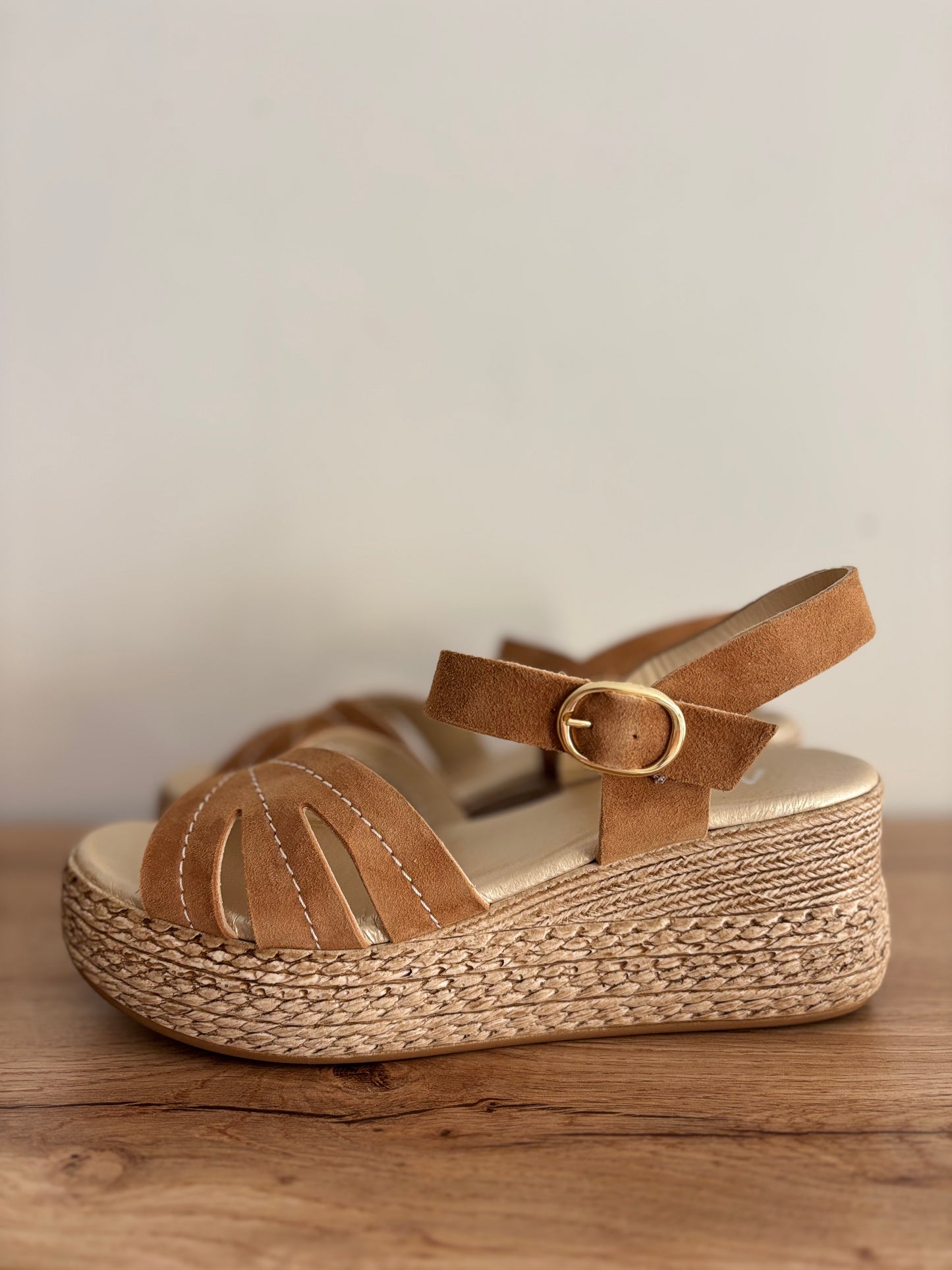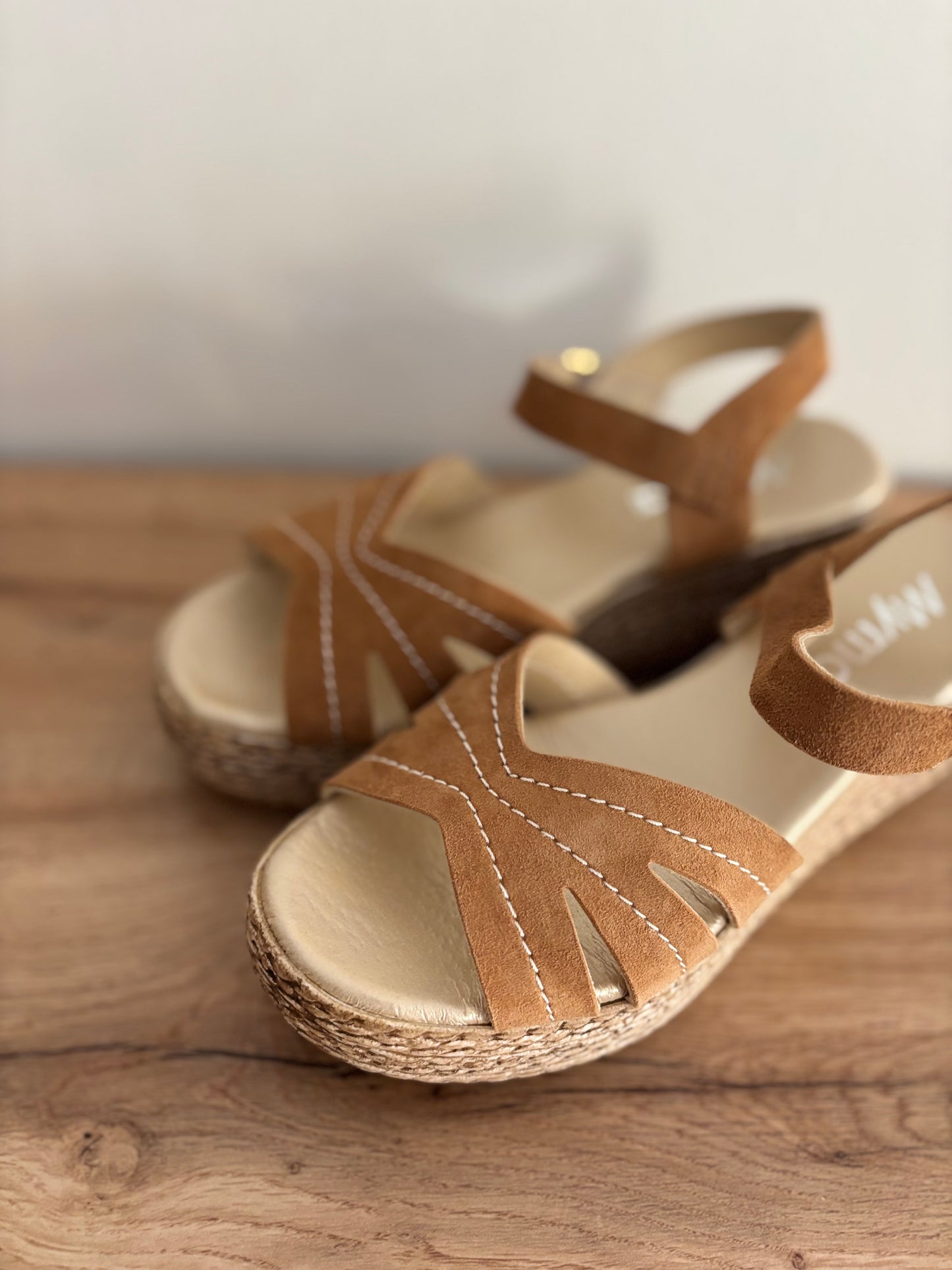 Sandales compensées en cuirs velours camel, détails des surpiqûres blanches, talon de couleur naturel est très léger.