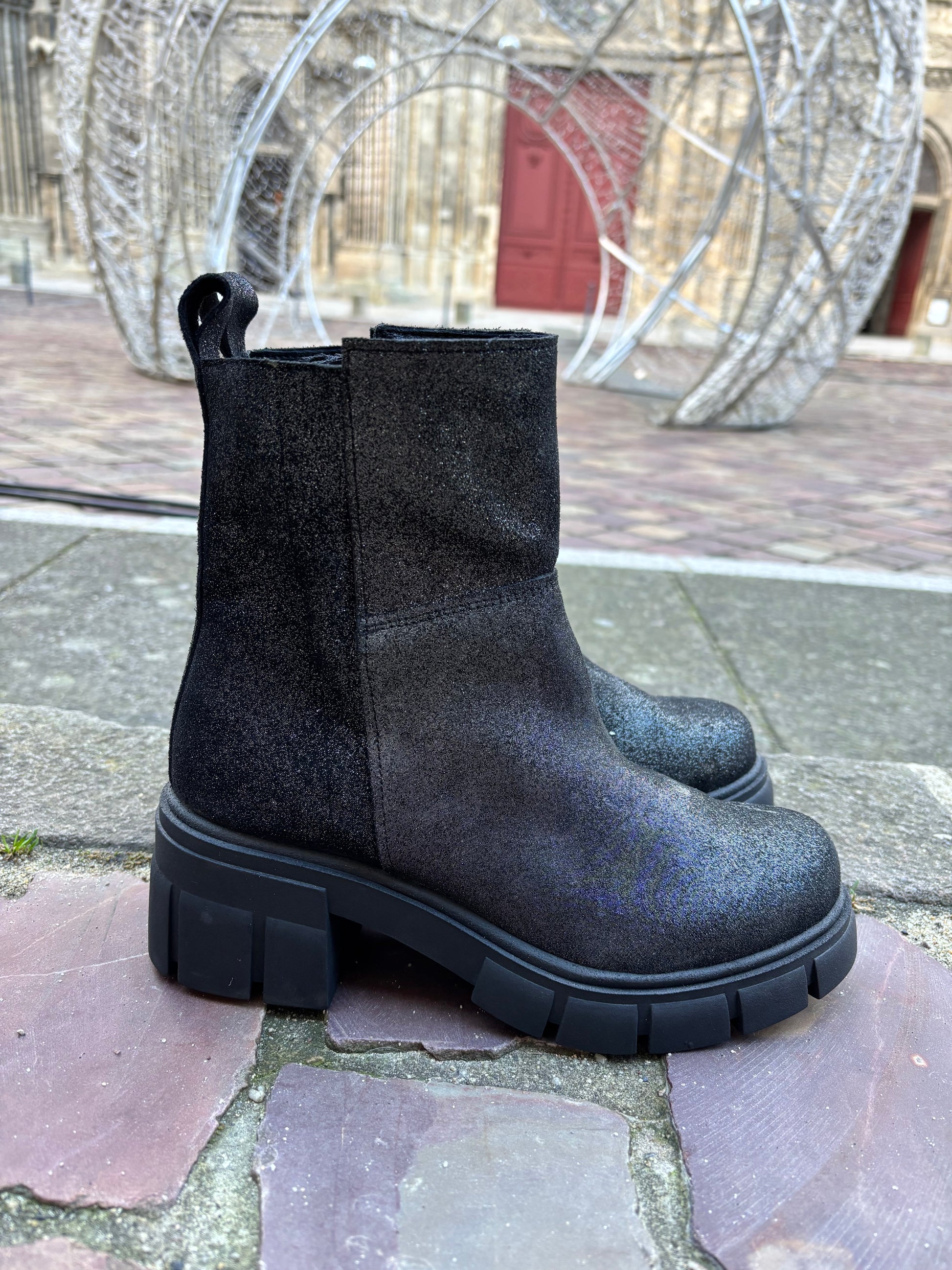 Bottines original avec un cuir scintillant argenté, un zip sur le côté pour un enfilage plus facile et rapide, sa semelle épaisse mais souple, le combo parfait pour passer l'hiver avec des chaussures qui changent de l'ordinaire !