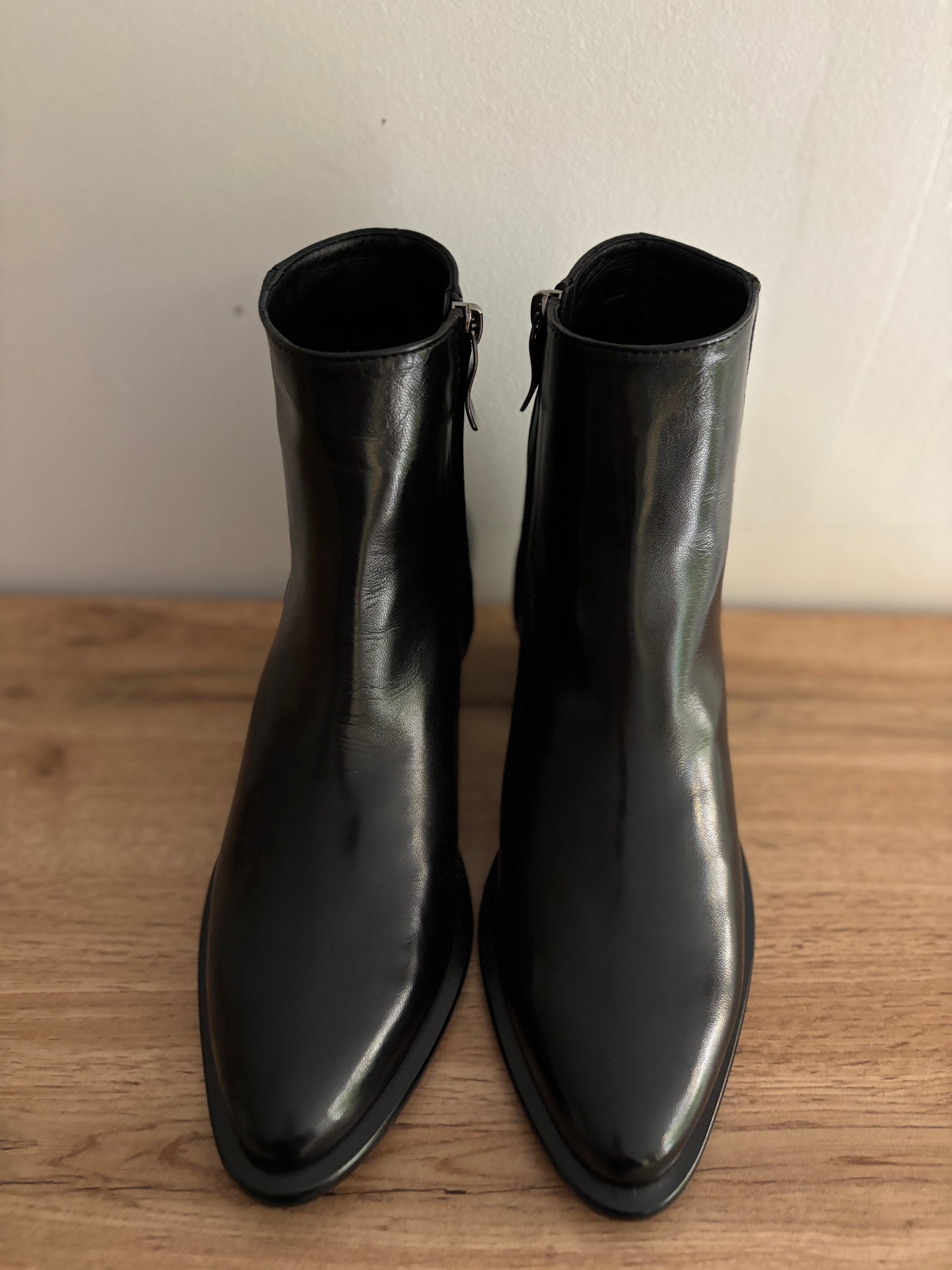 Cette bottine 100% en cuir d'agneau est un produit de haute qualité, un petit effet brillant la rend magnifique ! Son petit plus ? sa fermeture à l'intérieur pour un enfilage plus facile.