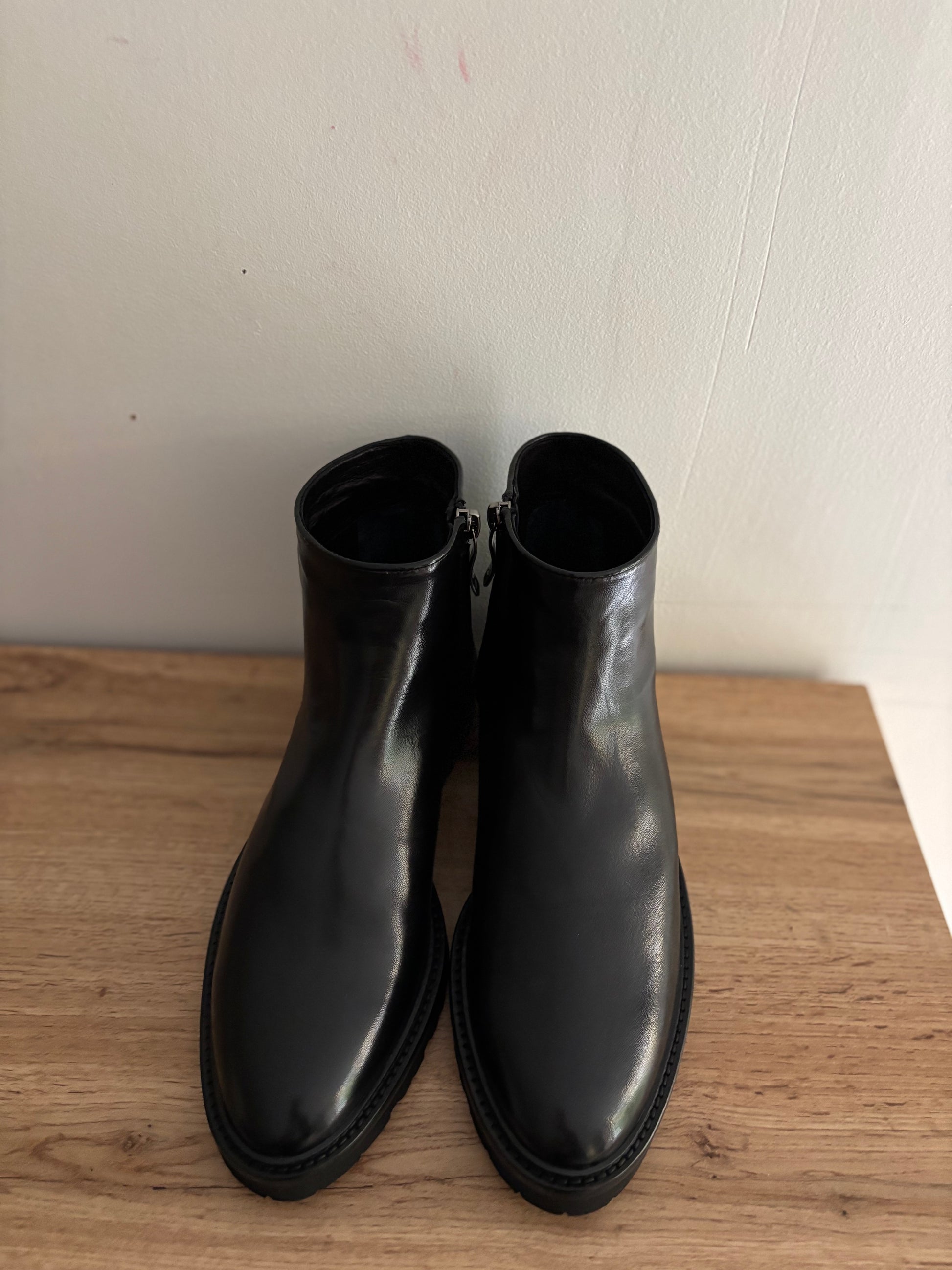 Cette bottine 100% en cuir d'agneau est un produit de haute qualité, un petit effet brillant la rend magnifique ! Son petit plus ? un zip à l'intérieur pour un enfilage plus facile.
