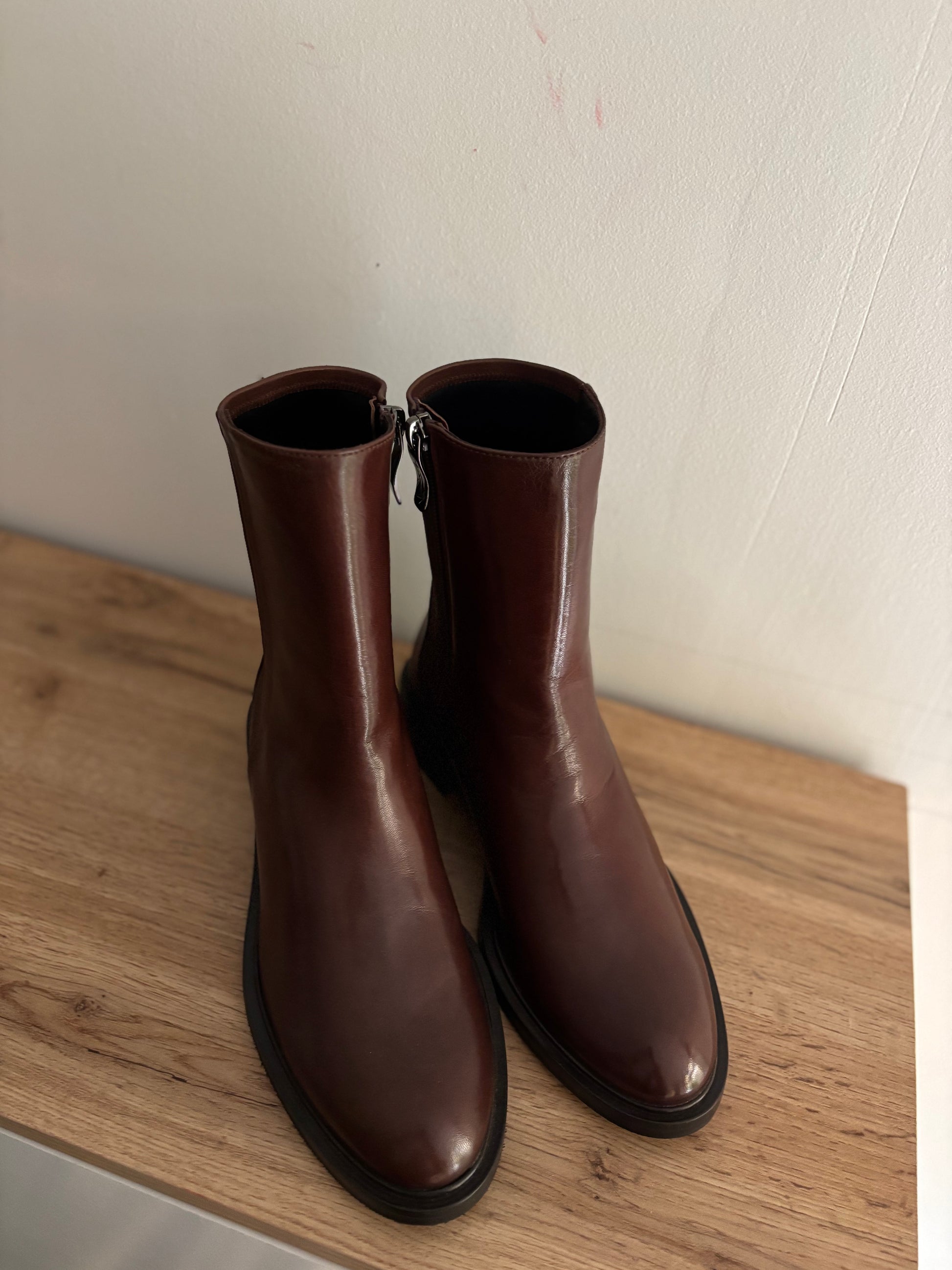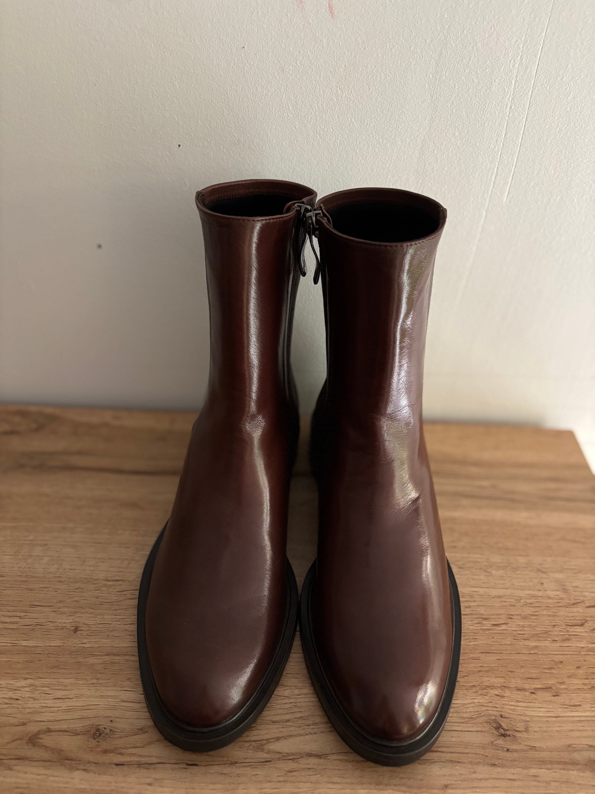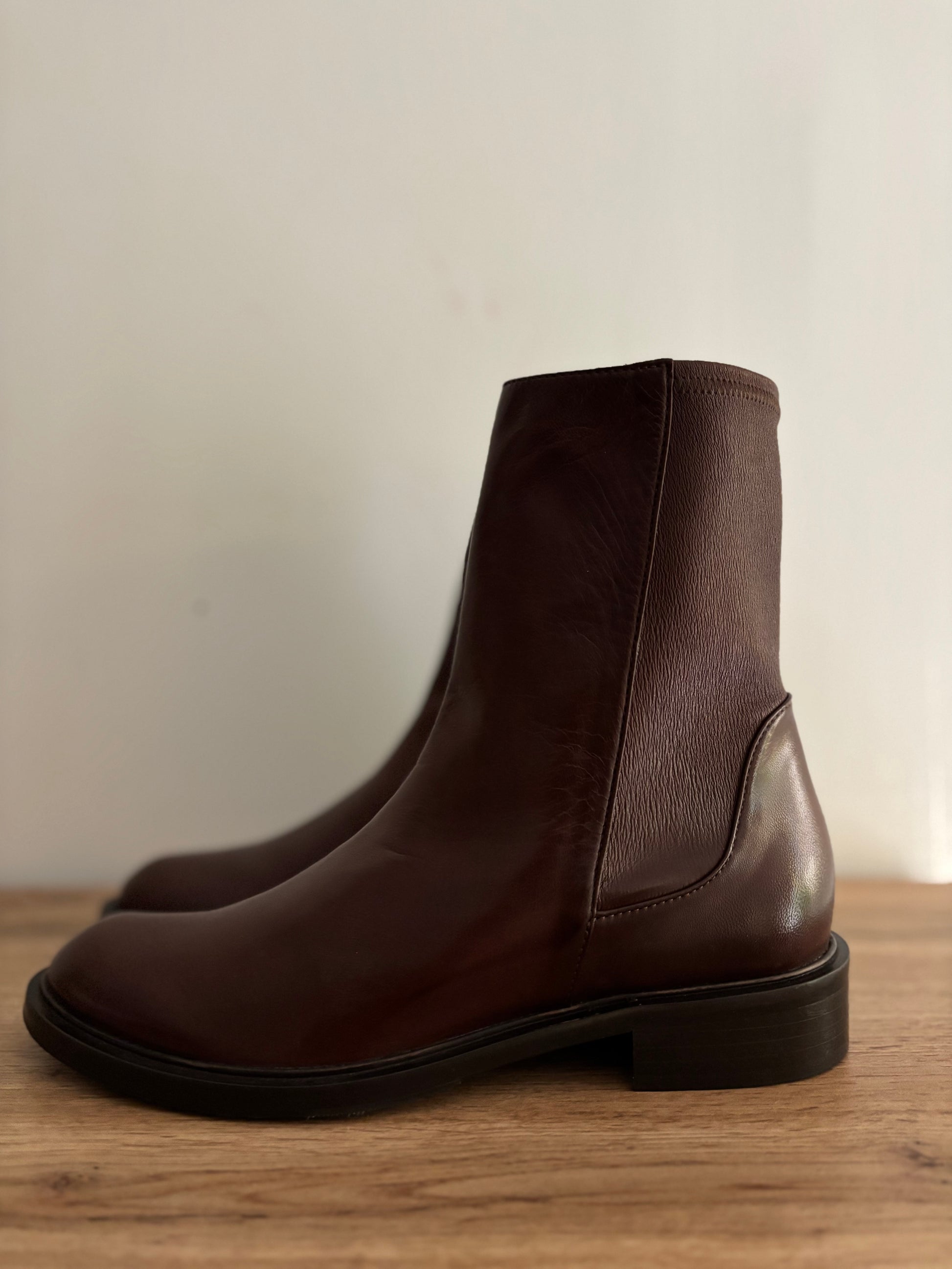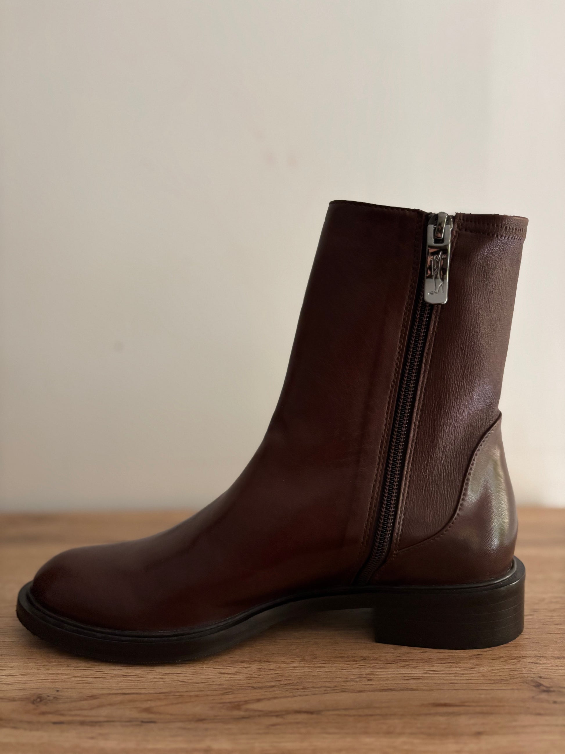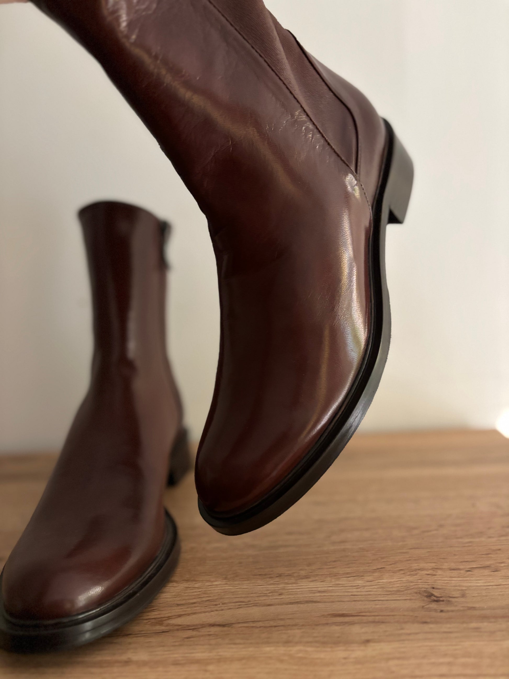 Cette bottine 100% en cuir d'agneau est un produit de haute qualité, un petit effet brillant la rend magnifique ! Son petit plus ? un cuir stretch à l'arrière pour avoir une tige près de la jambe avec un confort optimal.