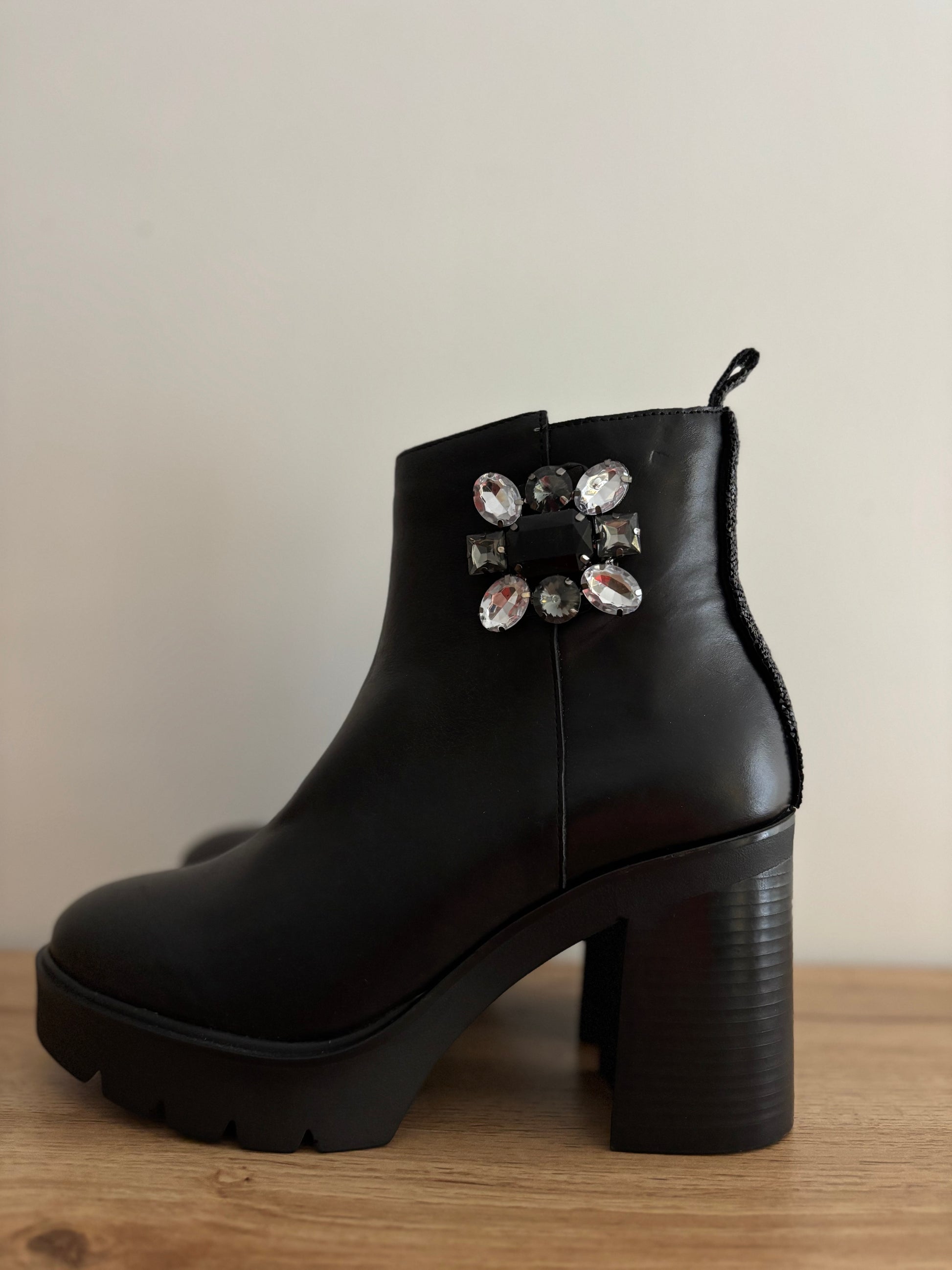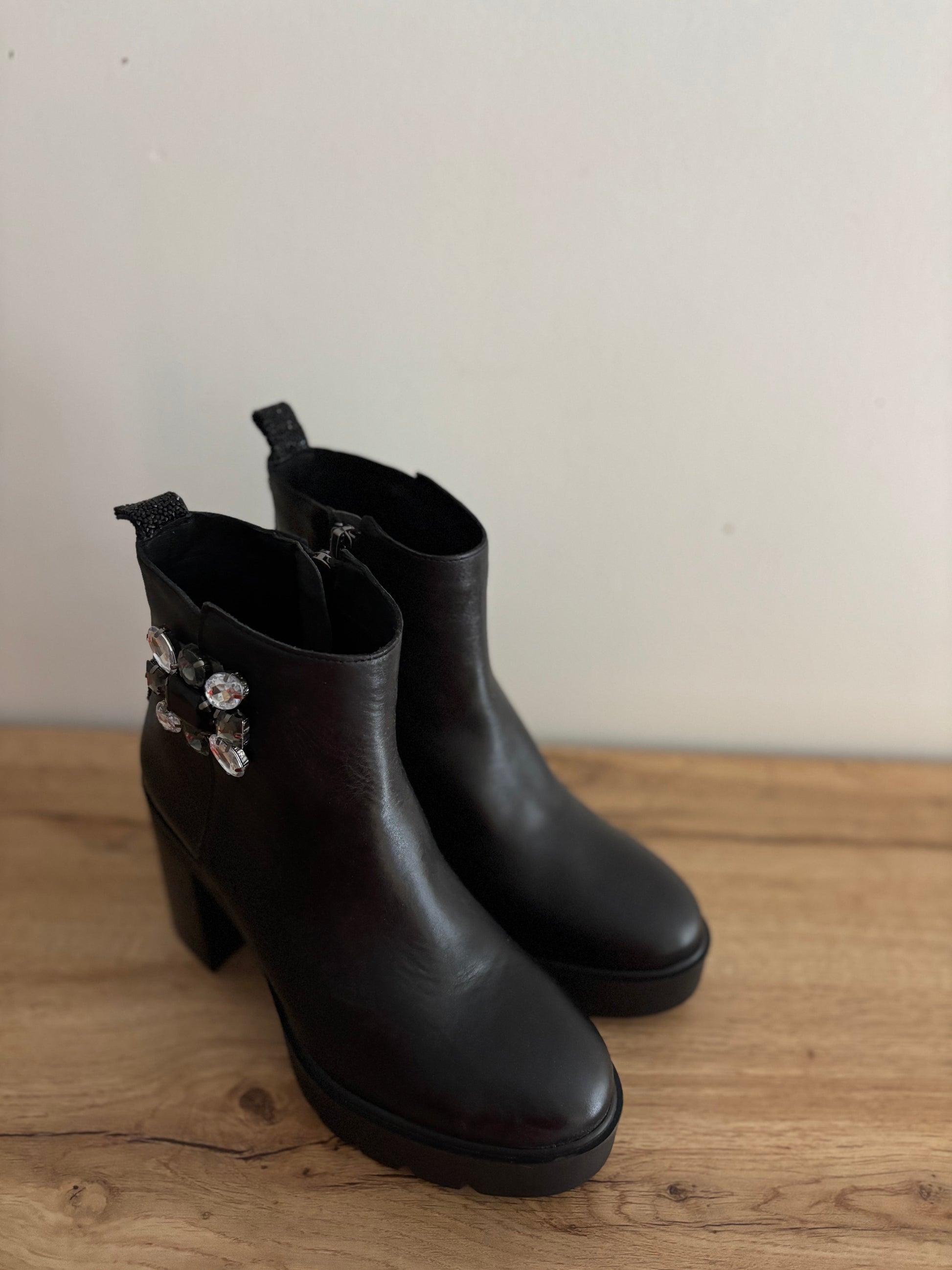 Cette bottine noir à talon de chez SWEET LEMON vous fera craquez par son look, ses détails brillant à l'arrière, son bijoux sur le côté, son confort. Elle a tout les atouts surtout son originalité