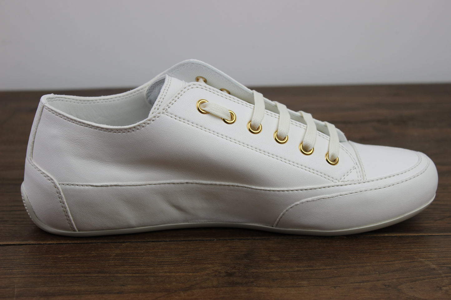 Cette baskets en cuir d'agneau trouve son équilibre esthétique dans un mélange de ligne épurées et une souplesse incroyable. La fine semelle en caoutchouc remonte légèrement jusqu'au talon, pour un détail distinctif. Existe également en bleu ciel.