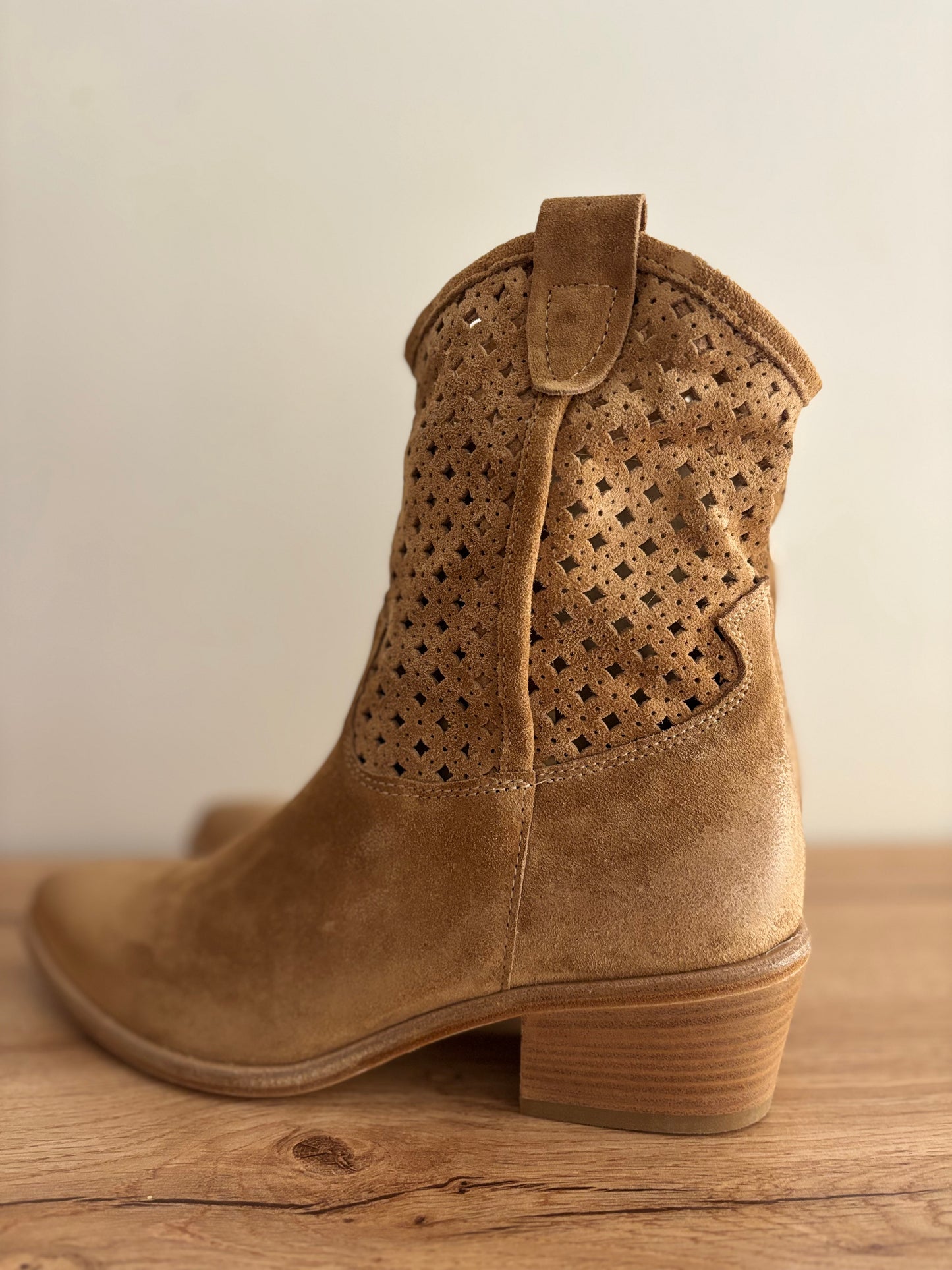 La bottine d'été style santiags en cuirs velours camel, la tige ajourée sera parfaite pour associer à une jupe ou une robe !